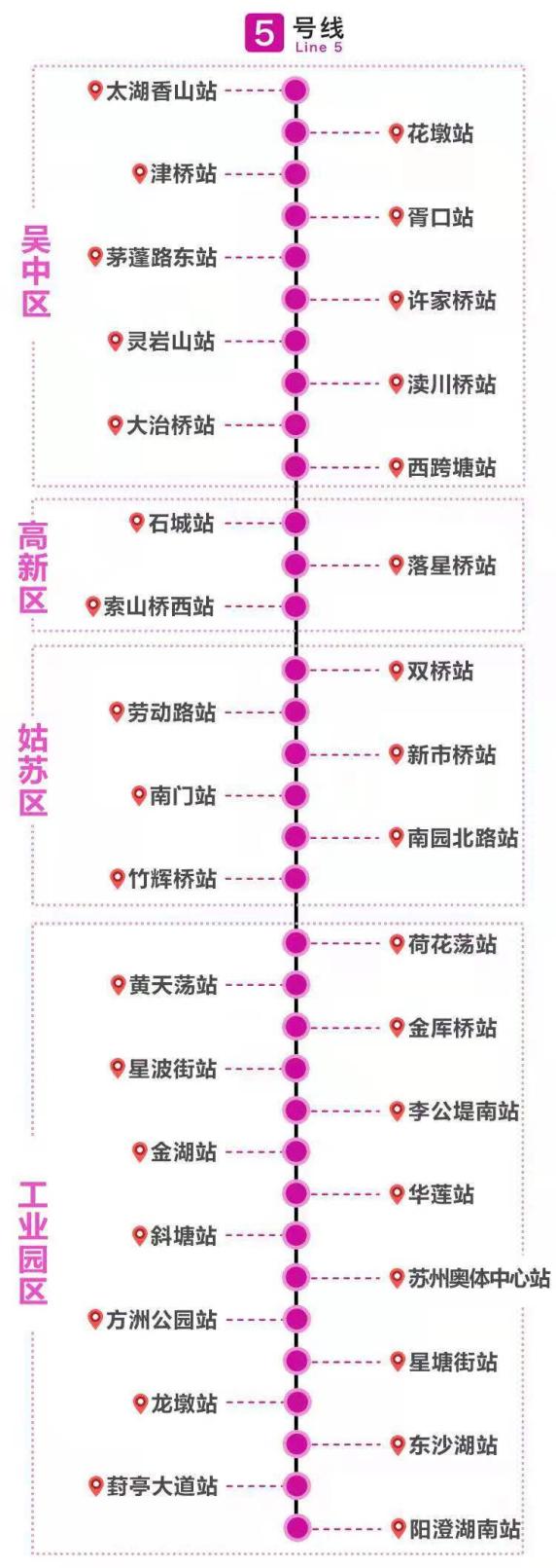 2020年6月29日10时,苏州轨道交通5号线(以下简称“5号线”)正式开通初期运营。线路全长44.1千米,共设34个站点,起于吴中区太湖香山站,至于工业园区阳澄湖南站,沿途穿山越湖(太湖、灵岩山、横山、金鸡湖、独墅湖、阳澄湖),是名副其实的苏州文化旅游特色线路。